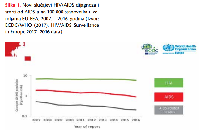 U zemljama Europske unije i Europsko Ekonomske zajednice (EU/EEA) tijekom posljednjeg desetljeća kontinuirano se smanjuju stope prijava novih slučajeva AIDS-a i smrti od AIDS-a. Pojavnost prijava novih infekcija HIV-om pokazuje relativno stabilno kretanje (Slika 1.). I iako se ukupno gledajući zemlje EU/EEA primjećuje pad prijava novih infekcija HIV-om, prijave HIV infekcija stalno rastu u 11 od 31 zemalja EU/EEA. Prema podacima prijava zaraznih bolesti Europskog centra za prevenciju i kontrolu bolesti (ECDC/WHO) u 2016. godini zabilježeno je oko 160.000 novih slučajeva HIV/AIDS-a u Europskoj regiji Svjetske zdravstvene organizacije (SZO), od čega oko 30.000 slučajeva u zemljama članicama EU/EEA. Polovica novih infekcija HIV-om u Europi dijagnosticira se kasno (50 % osoba s manje od 350 CD4 stanica na mm3 krvi u vrijeme dijagnoze HIV infekcije). Kasnije dijagnoze češće se bilježe kod starijih osoba (u dobi 40 do 50 i više od 50 godina), osoba heteroseksualne orijentacije, i korisnika injektirajućih droga.
