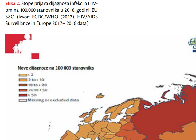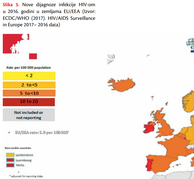 Kad gledamo Europsku regiju SZO, regija zemalja Istočne Europe, zajedno s Središnjom Azijom, je i dalje jedina regija na svijetu s rastućom epidemijom infekcije HIV-om, gdje se bilježi porast i velika učestalost infekcije HIV-om (18/100.000 stanovnika odnosno 50/100.000 s Rusijom). Opća stopa infekcije HIV-om u zemljama EU/EEA je 5.9 na 100.000 stanovnika (Slika 2.). Među prijavama infekcije HIV-om u 2016. godini u zemljama EU/EEA omjer muškarci – žene iznosio je 3.2. Spolni odnos između muškaraca (MSM) je i dalje najčešći prijavljeni put prijenosa (40 %) infekcije HIV-om u EU/EEA. Drugi najčešći put prijenosa je spolni odnos između žene i muškarca (oko 30 %), dok put prijenosa injektiranjem droga ima udio od 4 %. Hrvatska je među vodećim zemljama što se tiče postotka MSM među godišnjim prijavama HIV infekcije, već nekoliko posljednih godna, a u 2016. godini je bila na prvom mjestu po udjelu MSM među prijavama infekcije HIV-om za tu godinu.