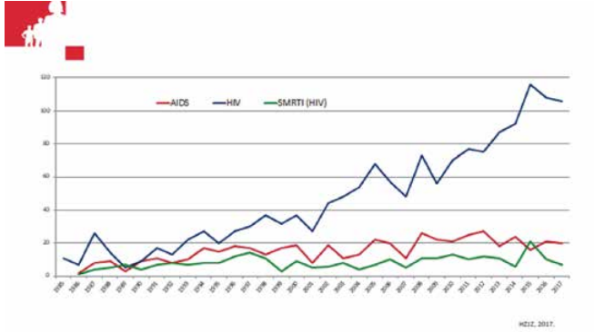 Slika 4. Nove dijagnoze HIV-a, AIDS-a i smrti zaraženih HIV-om u Hrvatskoj 1985. – 2017. godina (Izvor: Hrvatski zavod za javno zdravstvo)