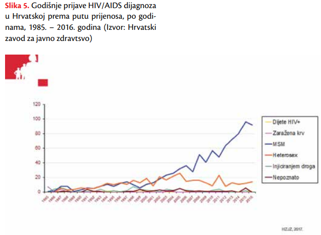 Od ukupnog broja svih slučajeva zaraze HIVom, većina (1 360 ili 88 %) su muškarci. Gotovo 90 % svih osoba koje žive s HIV infekcijm zarazili su se spolnim putem prijenosa virusa, a 5 % putem injektiranja droga. Prijenos s majke na dijete čini 1.2 %, a udio zaraženih putem krvnih preparata je 1 % od svih zabilježenih slučajeva zaraze HIV-om. Spolni odnos između muškaraca je i dalje najčešći prijavljeni put prijenosa: 64 % svih do sada zabilježenih slučajeva HIV/AIDS-a bili su muškarci koji imaju spolne odnose s muškarcima (MSM), a u posljednjih nekoliko godina više od 80 % godišnje dijagnosticiranih slučajeva infekcije HIV-om bili su MSM, i taj udio raste (Slika 5.). Broj prijava slučajeva HIV/AIDS-a u Hrvatskoj porastao je više od dva puta u usporedbi s razdobljem prije 2004. godine. Novi slučajevi zaraze HIV-om u Hrvatskoj pokazuju blagi trend porasta pojavnosti posljednih nekoliko godina, što dijelom možemo objasniti povećanim brojem testiranja i otkrivanja infekcije HIV-om, odnosno uvođenjem usluge dobrovoljnog, anonimnog i besplatnog testiranja na HIV u osam gradova u Hrvatskoj od 2004. godine. Broj oboljelih i umrlih od AIDS-a pokazuje padajući ili stabilan trend zahvaljujući dostupnosti antiretrovirusne terapije (ART) (Slika 5.). Iako se u Hrvatskoj bilježi poboljšanje u kaskadi skrbi oboljelih od HIV/AIDS-a u razdoblju od 2010. – 2014. godine, posebice u udjelu oboljelih na ART i onih s nemjerljivom količinom virusa u krvi, a udio nedijagnosticiranih se smanjio tijekom navedenog razdoblja, ciljano testiranje osoba u većem riziku od zaraze HiV.om, rano otkrivanje infekcije i pravovremeno liječenje ostaje glavni izazov za unapređenje skrbi oboljelih i prevenciju infekcije HIV-om.